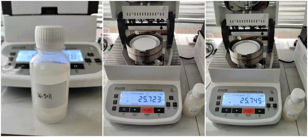6、做完溶液1的重復性測試后,我們對溶液2進行同樣的操作,重復上述步驟,得出溶液2兩次測試的固含量結果為25.723%和25.745%,誤差為0.022%。